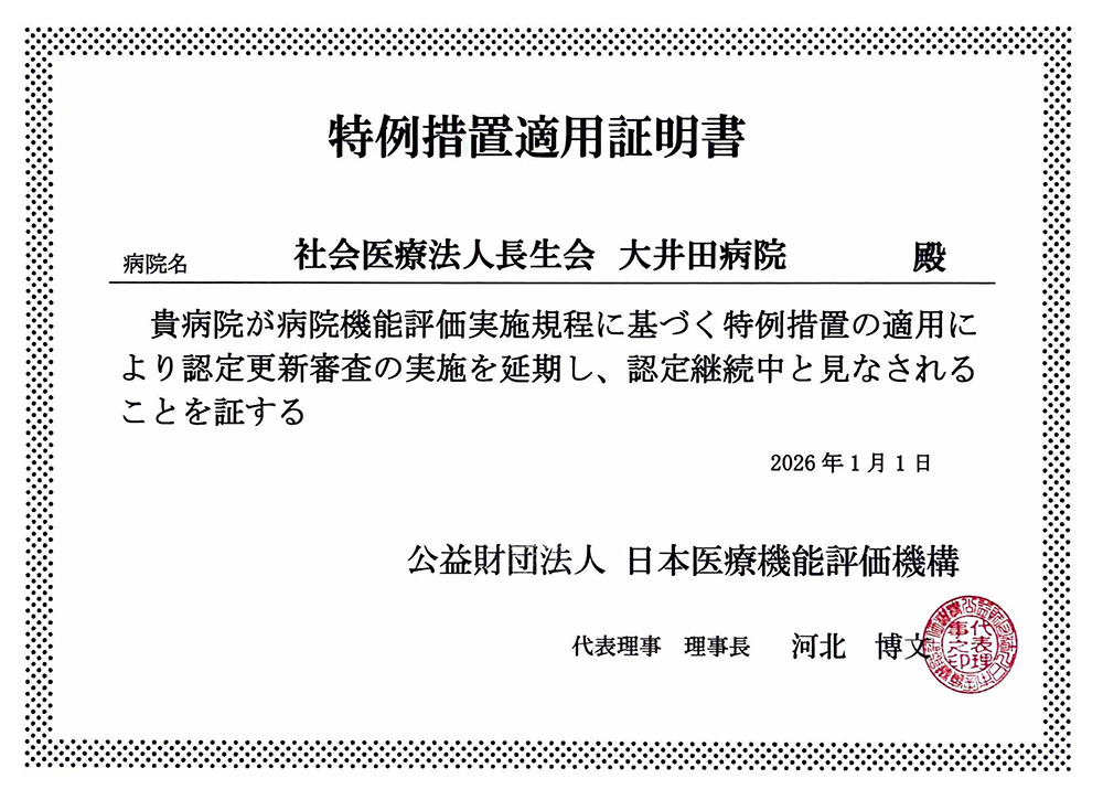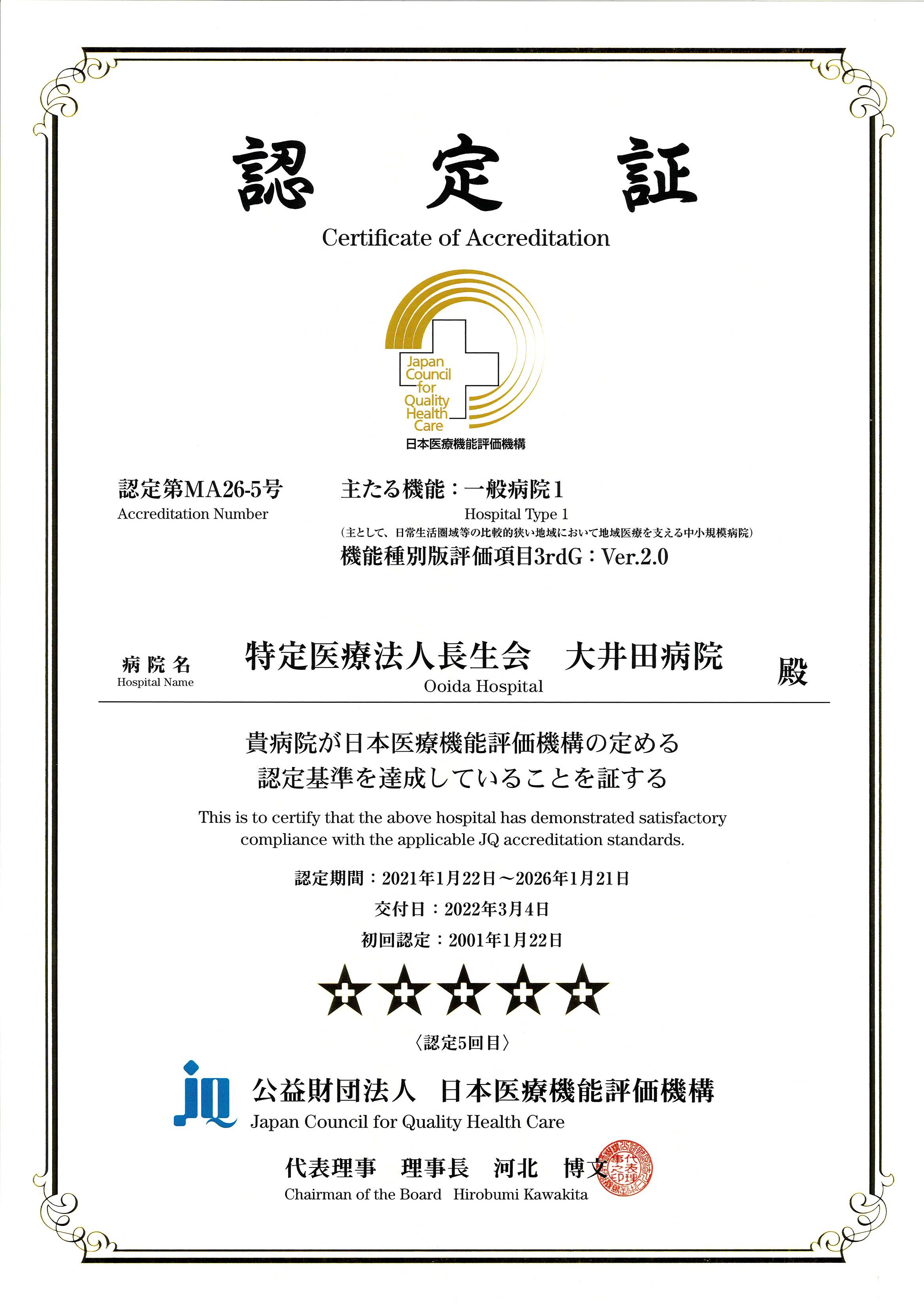 当院は2001年1月に最初の認定をいただき、その後も更新を重ね、2022年3月4日付で 機能種別版評価項目一般病院 3rdG:Ver.2.0で更新認定をいただきました。認定は今回で5回目となり、新たな認定期間を含めますと通算で約20年の長さになります。